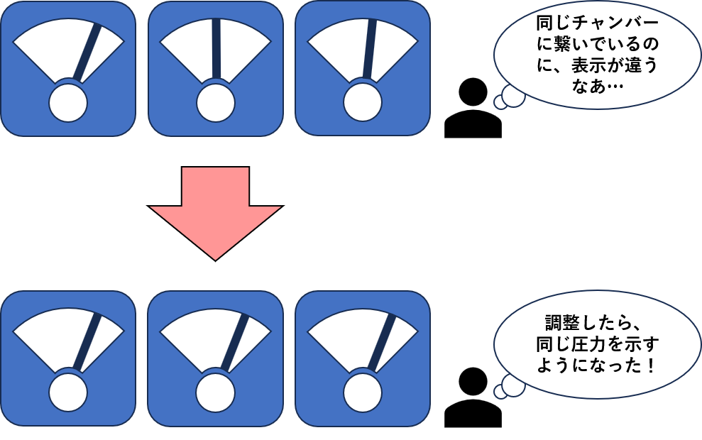 ズレた値を表示する真空計を基準に調整をすれば、すべての真空計が実際の圧力と異なる値を表示するようになります。